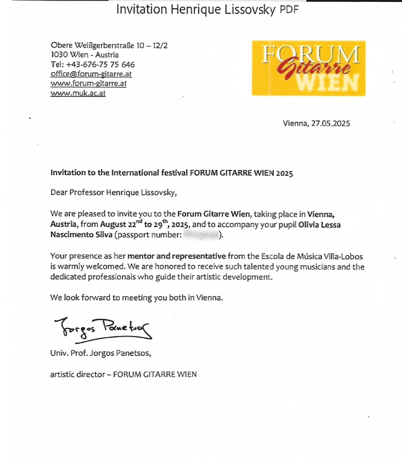 Convidado por Jorgos Panetsus, diretor artístico do Forum Guitarre Wien 2025, Henrique Lissovsky viajou para a Áustria com o apoio da Funarj/Secretaria de Estado de Cultura e Economia Criativa do Rio de Janeiro. O objetivo da viagem foi dar suporte à participação da violonista Olivia Nacimiento, então estudante do Curso Técnico Profissionalizante e inscrita na "Youth Competition", representando a Escola de Música Villa-Lobos/RJ.